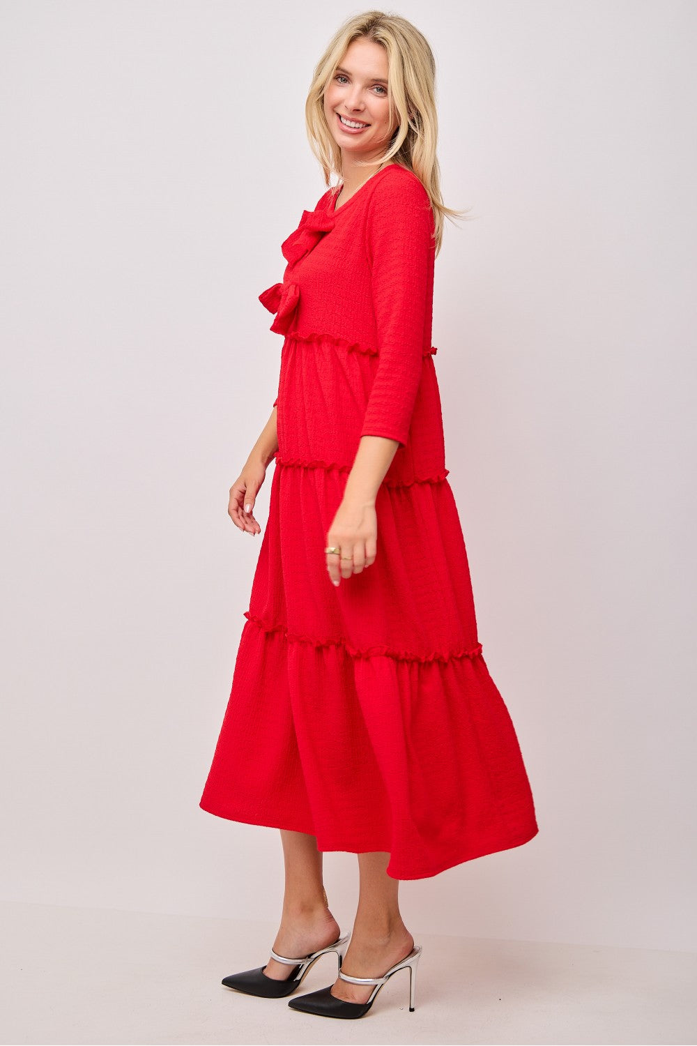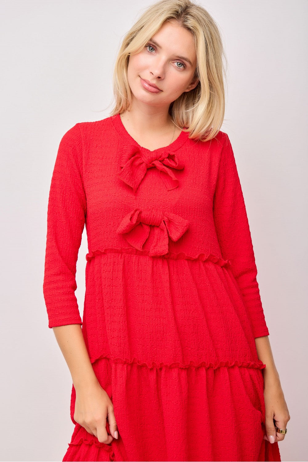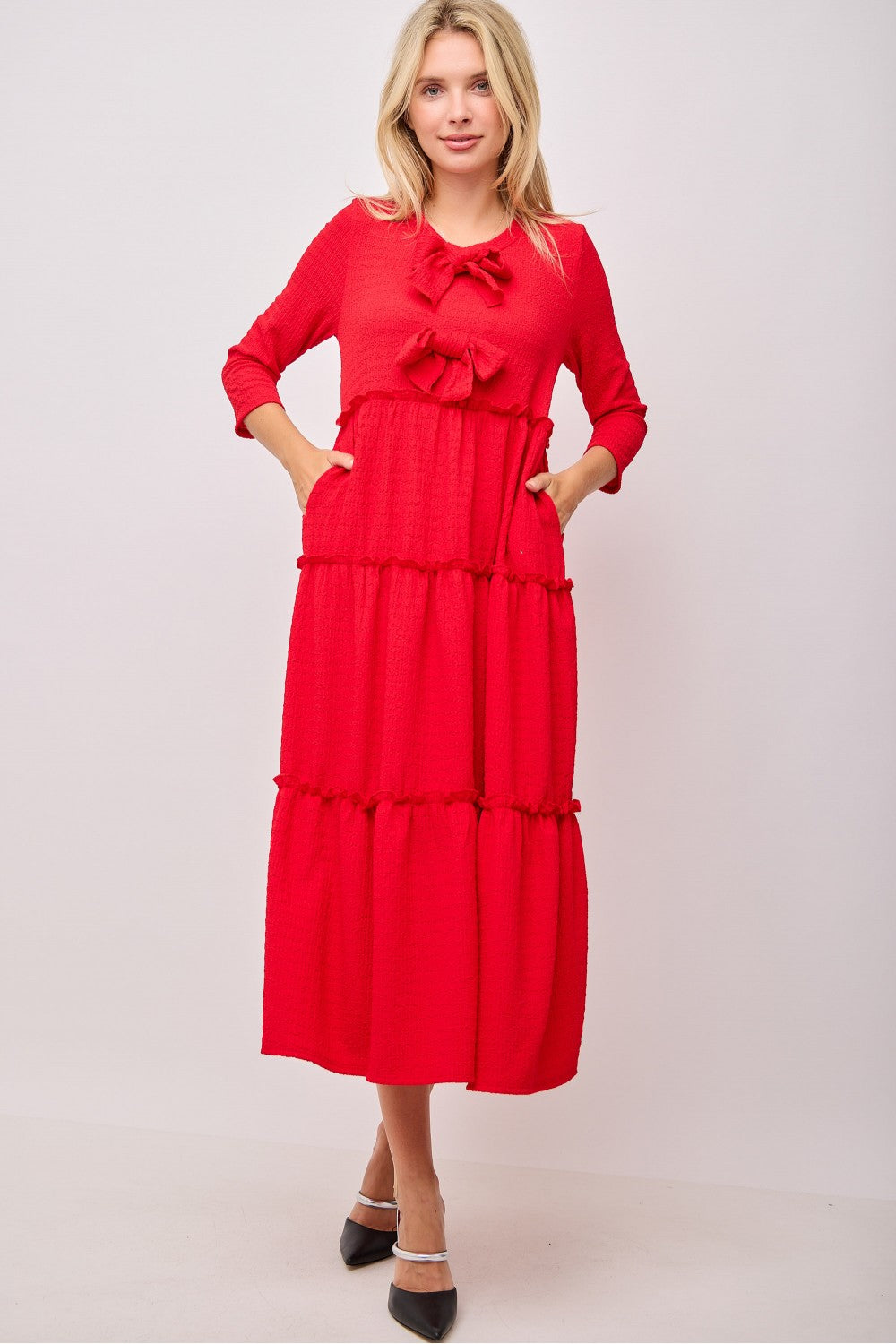 Introducing Blakely, the ultimate blend of style and practicality. The tiered ruffle design creates a flattering, flowy fit while double bow accents add a feminine touch. 3/4 length sleeves with subtle ruffle detailing and side pockets make this dress suitable for any occasion. Made with textured fabric for a touch of luxury.