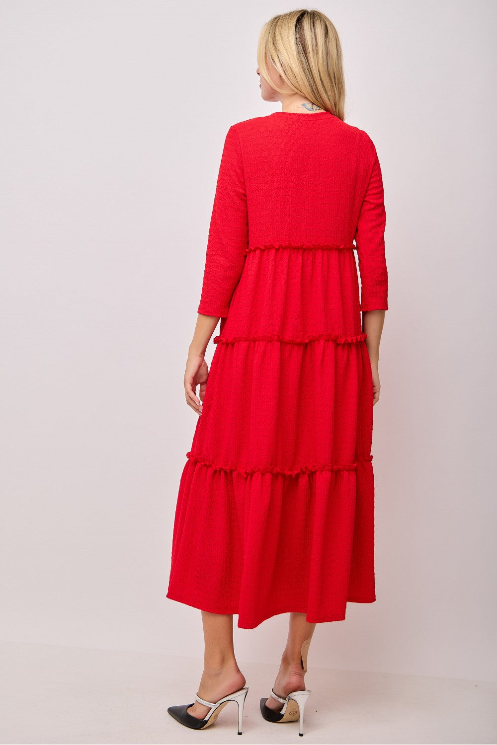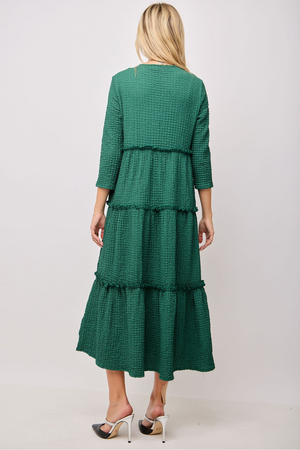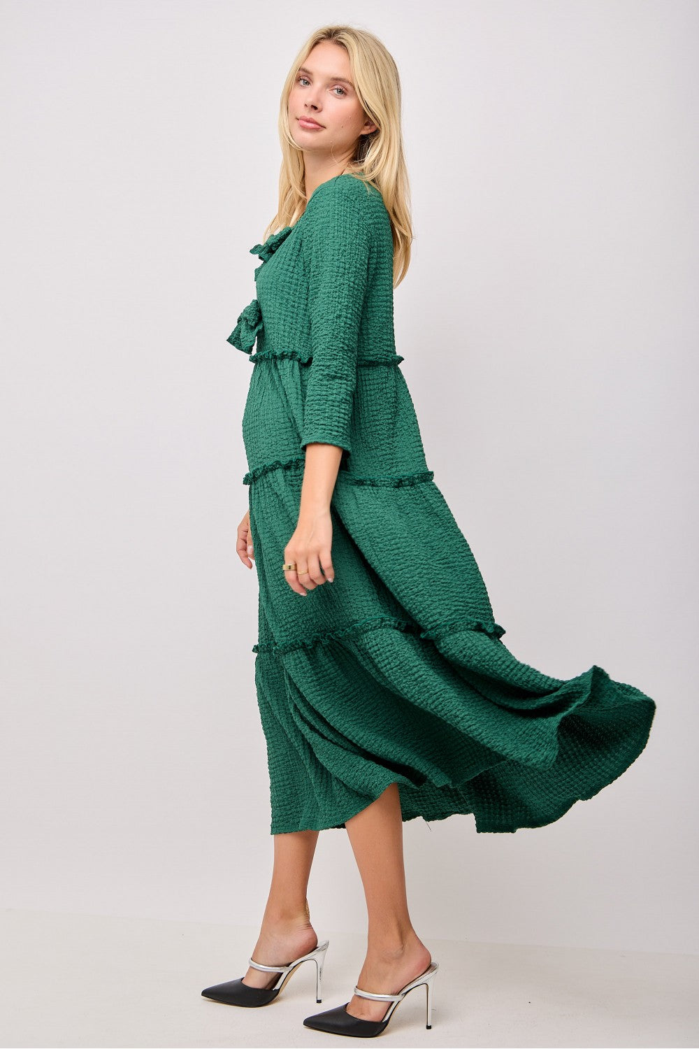 Introducing Blakely, the ultimate blend of style and practicality. The tiered ruffle design creates a flattering, flowy fit while double bow accents add a feminine touch. 3/4 length sleeves with subtle ruffle detailing and side pockets make this dress suitable for any occasion. Made with textured fabric for a touch of luxury.